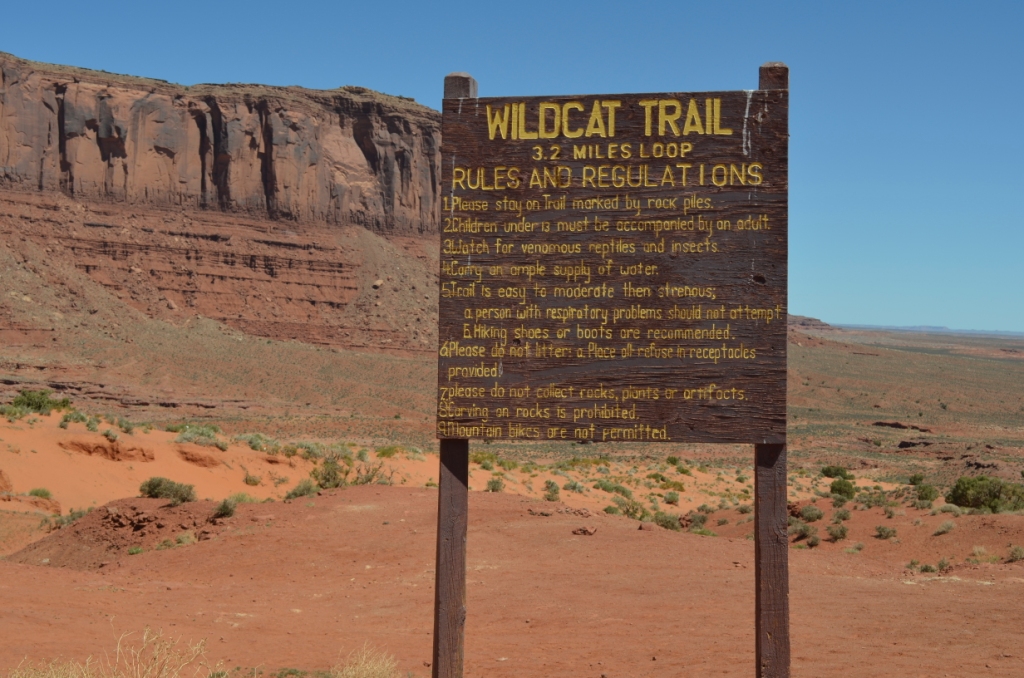 The only public hiking trail in Monument Valley is the Wildcat Trail. Much of the valley is privately owned, and it’s all on the Navajo Reservation, partly in Utah, and partly in Arizona. The sign on the trail head spells out everything a hiker needs to know.