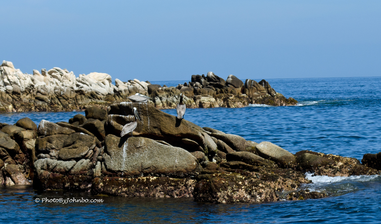 A trio of pelicans turned their backs and did their best to ignore our tour boat and all the ruckus caused by the snorkelers and kayakers interloping on their home.