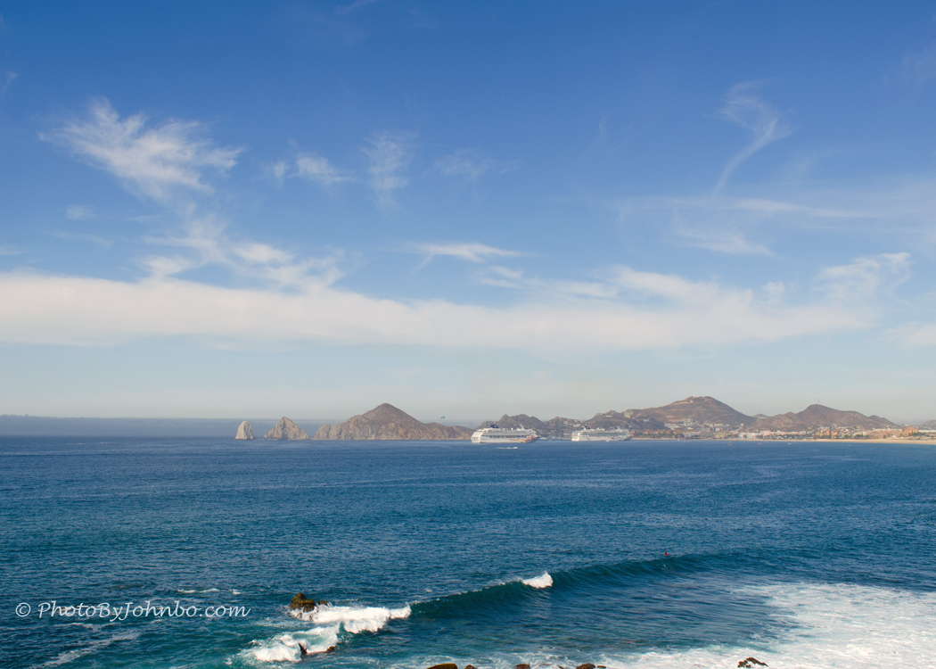 Our selected excursion included a boat ride along the coast to the tip of the peninsula in the Gulf of California, then north along the Pacific Ocean side for a couple of miles. We would return the way we came back to the marina at Cabo. There, we boarded a bus for a trip through town where we would stop at a scenic point overlooking the bay, have a cerveza, and head back to town for shopping or to reboard the ship for our last day at sea.