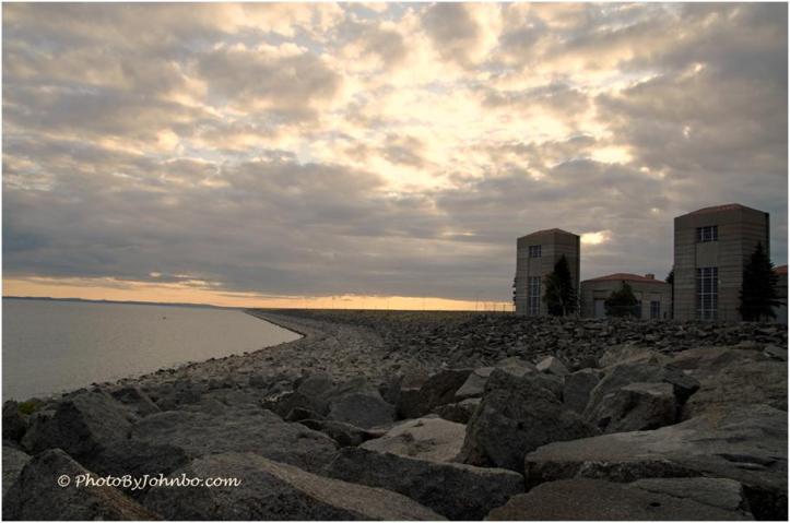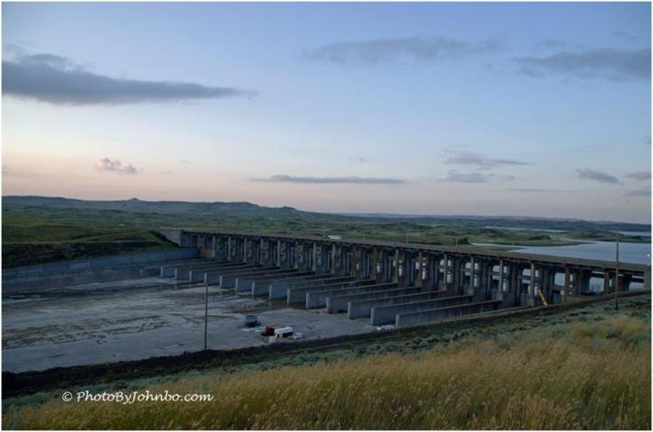 Fort Peck Dam and Lake at dusk. The two towers at the right house two of the four mechanical gates that can be closed to shut off flow out of the reservoir.