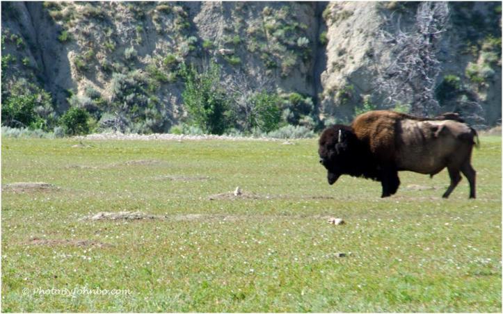 Just as we were leaving the information center, a gentleman on his way in mentioned that if we want to see buffalo, we should take the left fork and follow the scenic road opposite the direction that most people would take. We would end up doing the tour “backward”, (not that it matters.) We took the gentleman’s advice and in only a few miles, we came upon the herd of buffalo (properly named American Bison.) Except for one individual, they were some distance from the road and even with my 270mm lens; they were too far away from us to get any decent photos.