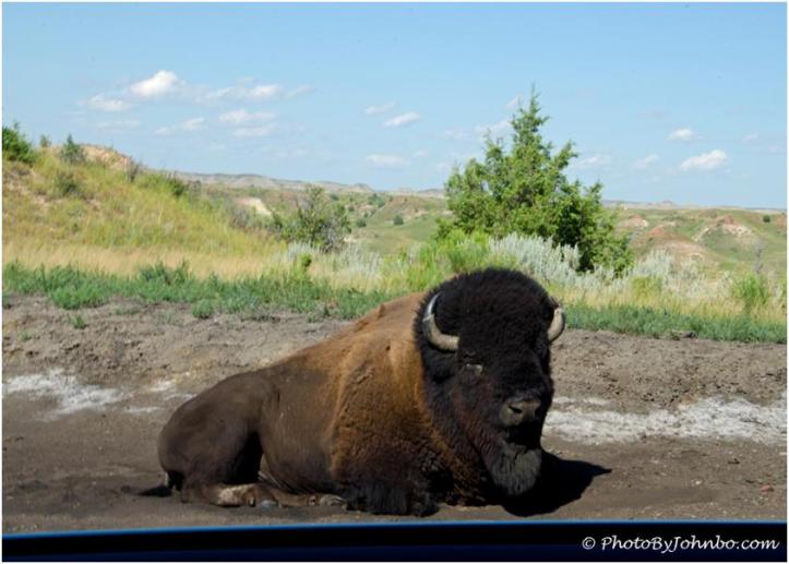Shortly after leaving the area where we stopped to watch the buffalo herd, we were following a large pickup and camper trailer. They were travelling faster than us, and rounding a curve, we were surprised to see them stopped in the right-of-way on the two-lane scenic drive. We stopped behind them and waited for a few minutes, wondering what they saw, considering we’d just passed a turnout to a scenic overlook, there didn’t seem to be too much to see right here. When they pulled away, however, we saw the bison. He was only a few feet from the road edge and was apparently enjoying the view of vehicle traffic along the highway. He was standing at first, but as we came alongside, he lay down and watched us as we stopped and I grabbed a couple of photographs. We didn’t stay long as we didn’t want to find out if the clicking of a camera shutter might be an annoyance to the beautiful animal.