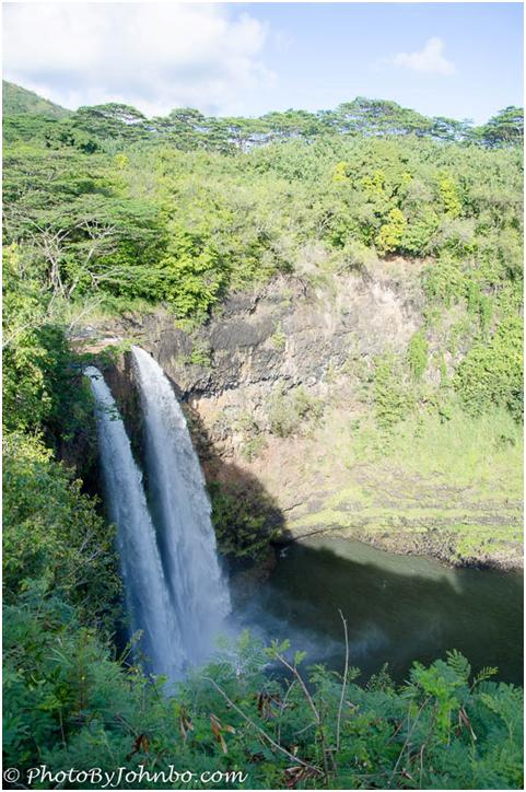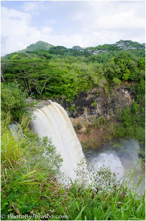 The first photo of the two was taken November 4, 2013. A few days later, a day-long rain showered the mountains above, feeding the Wailua River. Two days after the rains subsided, the volume of water in the river was still great enough to appear as a single waterfall.