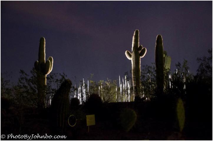 Lighted spires provide an eerie backlight for the collection of nearby saguaro