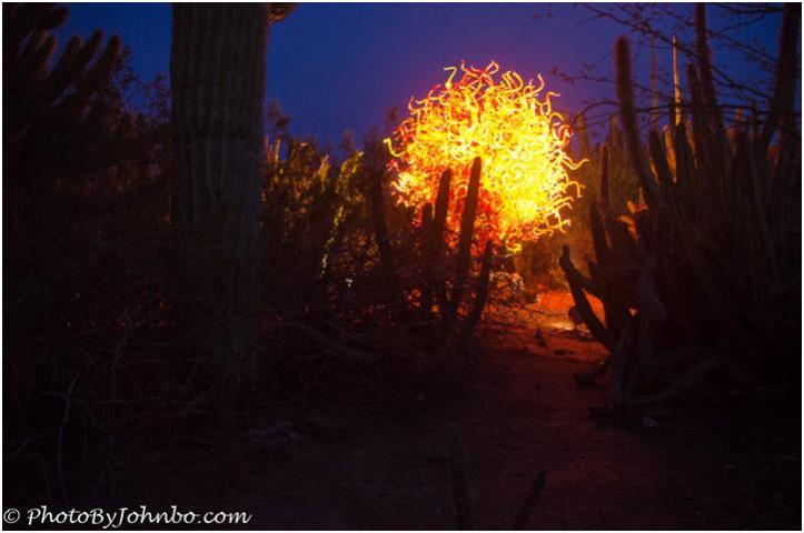 A Chihuly glass fireball illuminates the nearby organ pipe cactus