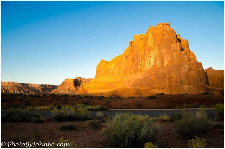 The sun, having barely risen above the La Sal Mountains to the east, has not yet illuminated the valley in Arches National Park