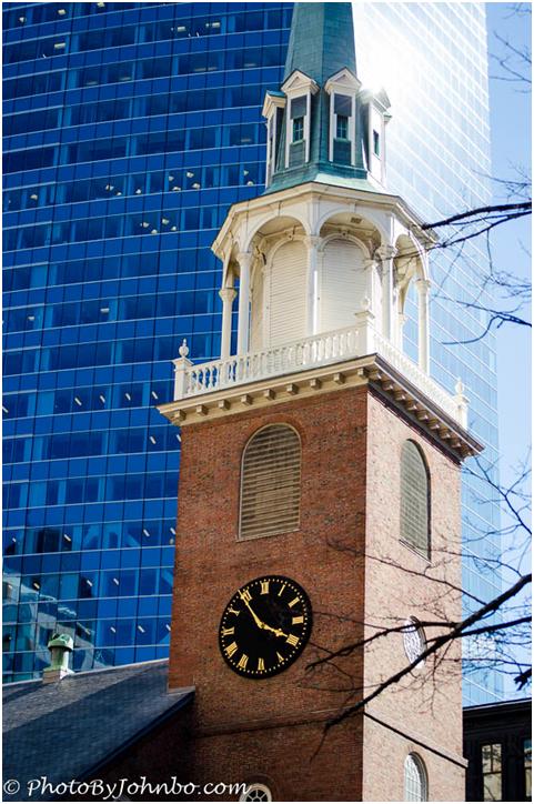 The steeple of the Old South Meeting House where plans were laid for the American Revolution lies in the shadow of a modern glass and steel skyscraper.