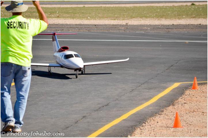 After landing, the jet taxies to the ramp. The flight marshal provides a reference as to the aircraft’s actual size.