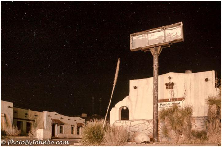 Underneath a starry New Mexico sky, this abandoned motel is illuminated only by nearby street lights.