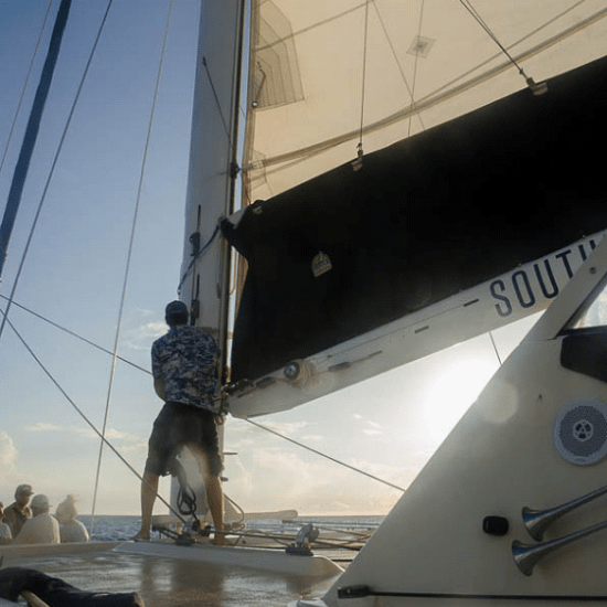 The first part of the cruise is under power of the ship’s diesel engines. First travel is westbound, then north along the western coast of the island, typically upwind. When the sea goddess is not amused, the trip upwind can be challenging for those who might suffer from motion sickness. The trip, however, is planned so that dinner is served on the way back to Port Allen. The vessel turns southward, engines are shut off, sails are hoisted and riding with the wind makes for a surprisingly calm sail, perfect for dinner service.
