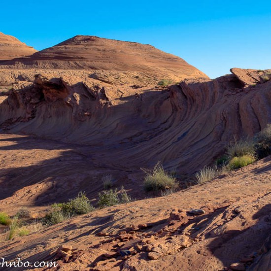 Much of the terrain around Page is composed of sandstone. A geologist would identify sandstone as a “clastic sedimentary rock“. In plain English, rock that’s composed of fine grains of sandy material bound together with a natural cement. Wind and water erosion creates interesting and often spectacular textures in the relatively porous sandstone base. I submit for your visual consumption a small gallery of sandstone images taken near the Glen Canyon Dam on the Colorado River at Page, Arizona. Click on an image below to view the photo in larger size and scroll through the gallery.