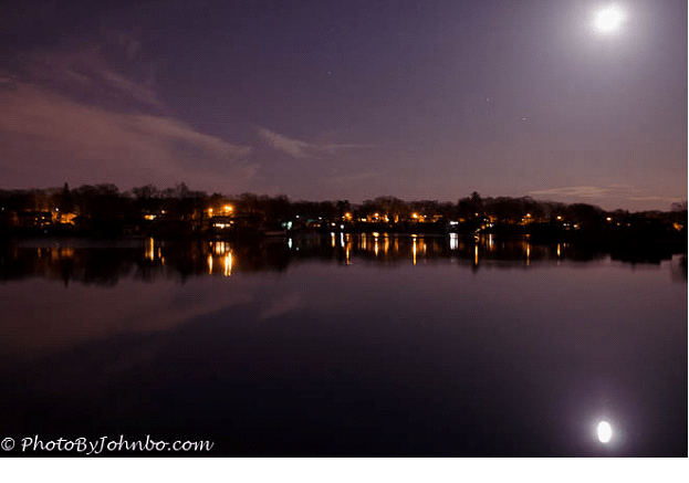 Available light with a tripod supporting a DSLR camera is not only possible at night, it’s amazing for the ability to capture low light with the tripod allowing long exposures. This photo of Lake Quinsigamond in Worchester, MA is one of my favorite night shots. It was taken with a model D5100 Nikon camera with a 6-second exposure at f/4.0 and an ISO of 800.
