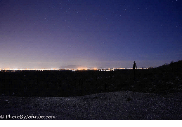 In the White Tank Mountain Regional Park, visitors can join a park ranger for a nighttime hike. I’ve found that if people don’t use flashlights, the human eye does a beautiful job of adapting to the only light provided by the full moon. This view is looking east toward the Phoenix metro area. The shadowy mountain in the center of the screen is the iconic Camelback Mountain, about a 45-minute drive from the photographer’s position. This shot was taken with a Nikon D5100 camera with a 10-second exposure at F/3.5 and ISO 800.