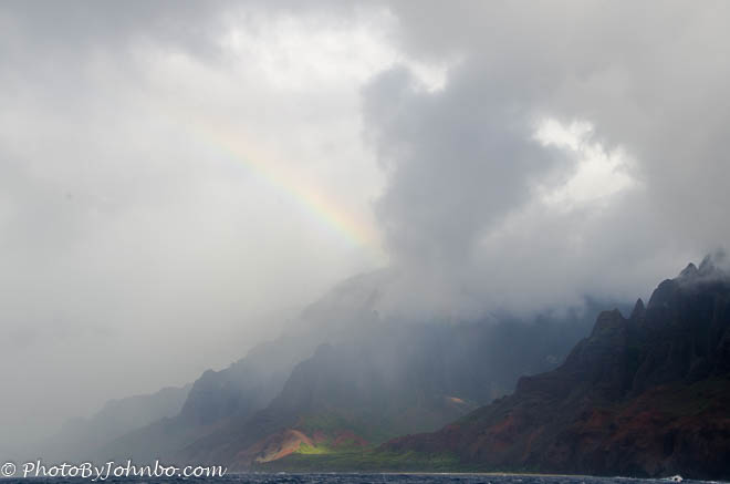 In the opening example, a weak rainbow makes an appearance in the midst of a squall off the Na Pali Coast on the Hawaiian Island of Kauai. Hawaii is known as the “Rainbow State” as the ever present sunshine and mist on the island are all the components needed to create a rainbow.