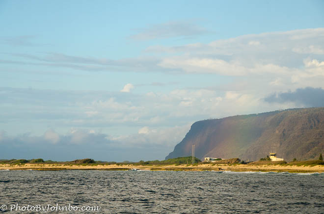 My next example is also taken along the western coast of Kauai. If you look closely at the cliff behind the Barking Sands military base, you will notice a weak prism effect. Actually, I don’t remember seeing the rainbow effect when I was taking the photo, so this rainbow may be an example of an aberration in my camera lens.