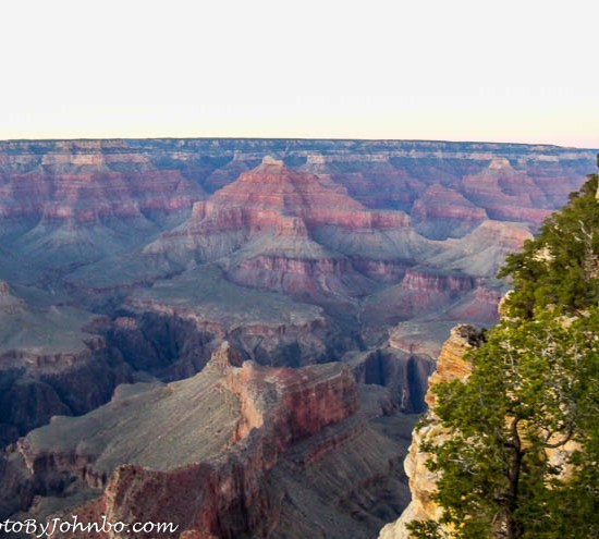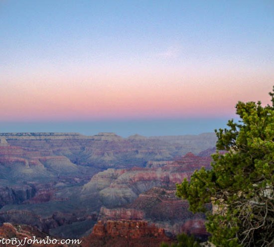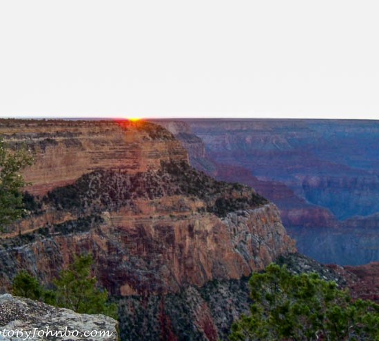 The two days we spent at the canyon were clear and comfortable in the mid-70s F. (21 C.), though it was probably nearing 100 degrees F. (38 C.) on the canyon floor. More athletic visitors have many options to view the canyon from below. Backpacking, mule riding, and river rafting are all popular venues for viewing the lower canyon. I submit for your visual entertainment a gallery of images at sunset taken in early October at Grand Canyon National Park, Arizona. Click on any of the images below to enlarge and to scroll through the gallery.