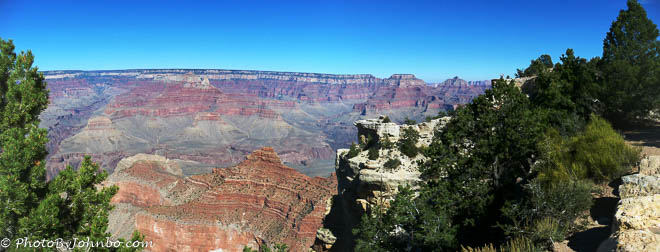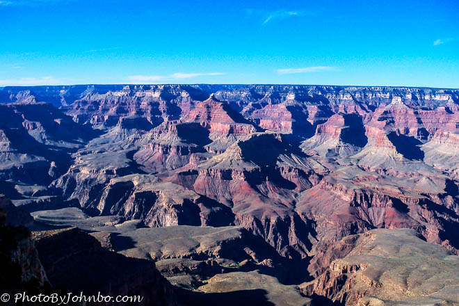 As you may note in the photo above, the canyon is not one single gorge, but a myriad of gorges etched out of the landscape over the centuries by the Colorado River and her tributaries along the canyon’s 275 mile (442 km) length. On our trip, we visited the South Rim, easily the most popular and easiest to visit portion of the national park. Though the north rim of the park is only ten miles (16 km) as the crow flies, the closest path is a 21 mile (34 km) hike across the canyon along the North and South Kaibib trails. For most people, this is an overnight trek. A foot bridge along the trail crosses the river about 70 feet (21 m) above the water surface.