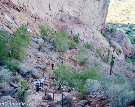 The trail, categorized as difficult, has spectacular views along the way up, and for the purposes of this photo challenge, on the descent as well. Though some might make this 1.1 mile (1.7 km) hike in only a couple of hours, the 1200 foot (365 m) ascension took us into the early afternoon. We would soon learn that the descent would take us longer than the ascent. I submit for your critical examination, a gallery of images featuring a descent from the Peak of Camelback Mountain. Click on any image below to enlarge it and to scroll through the gallery.