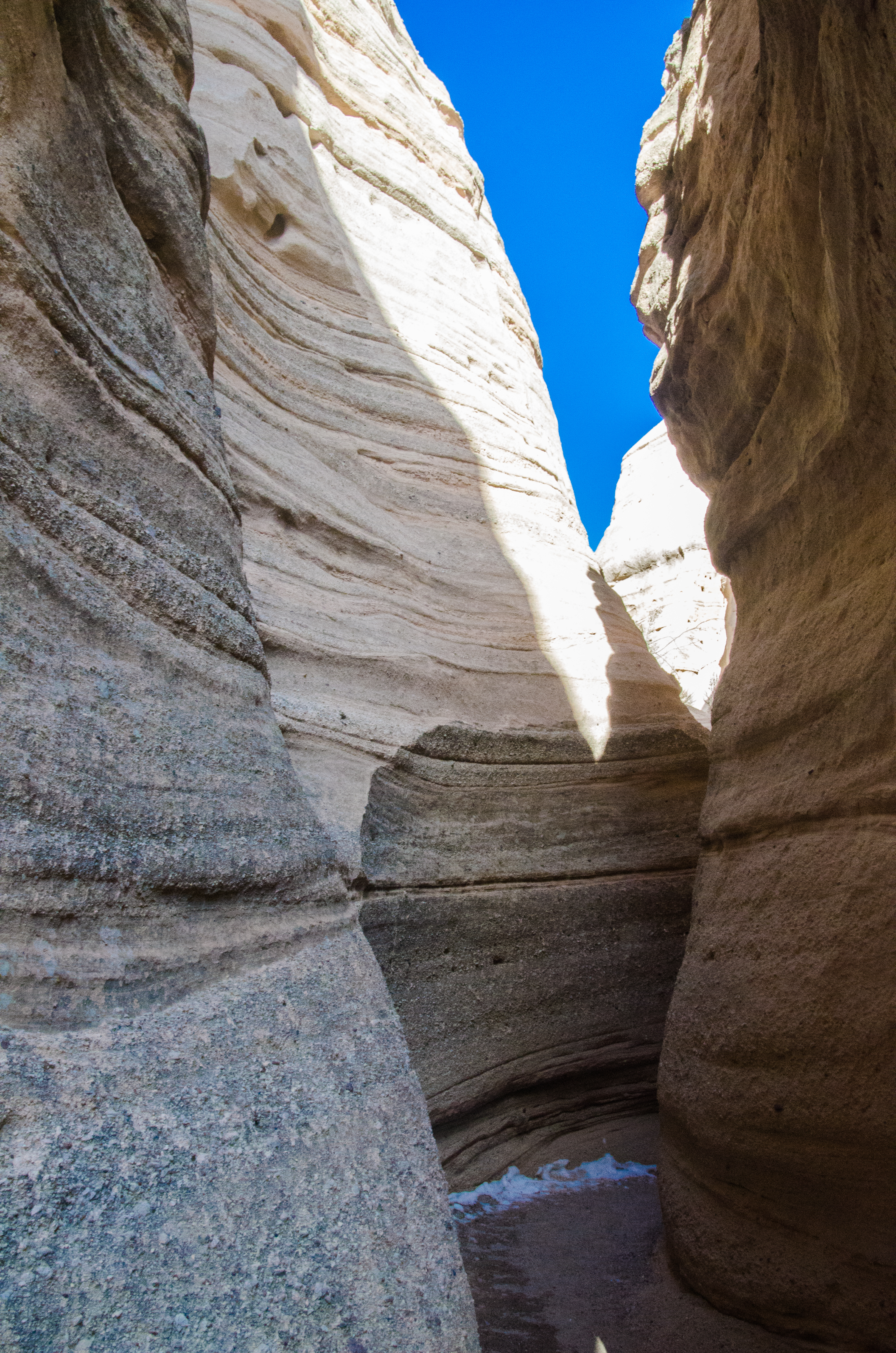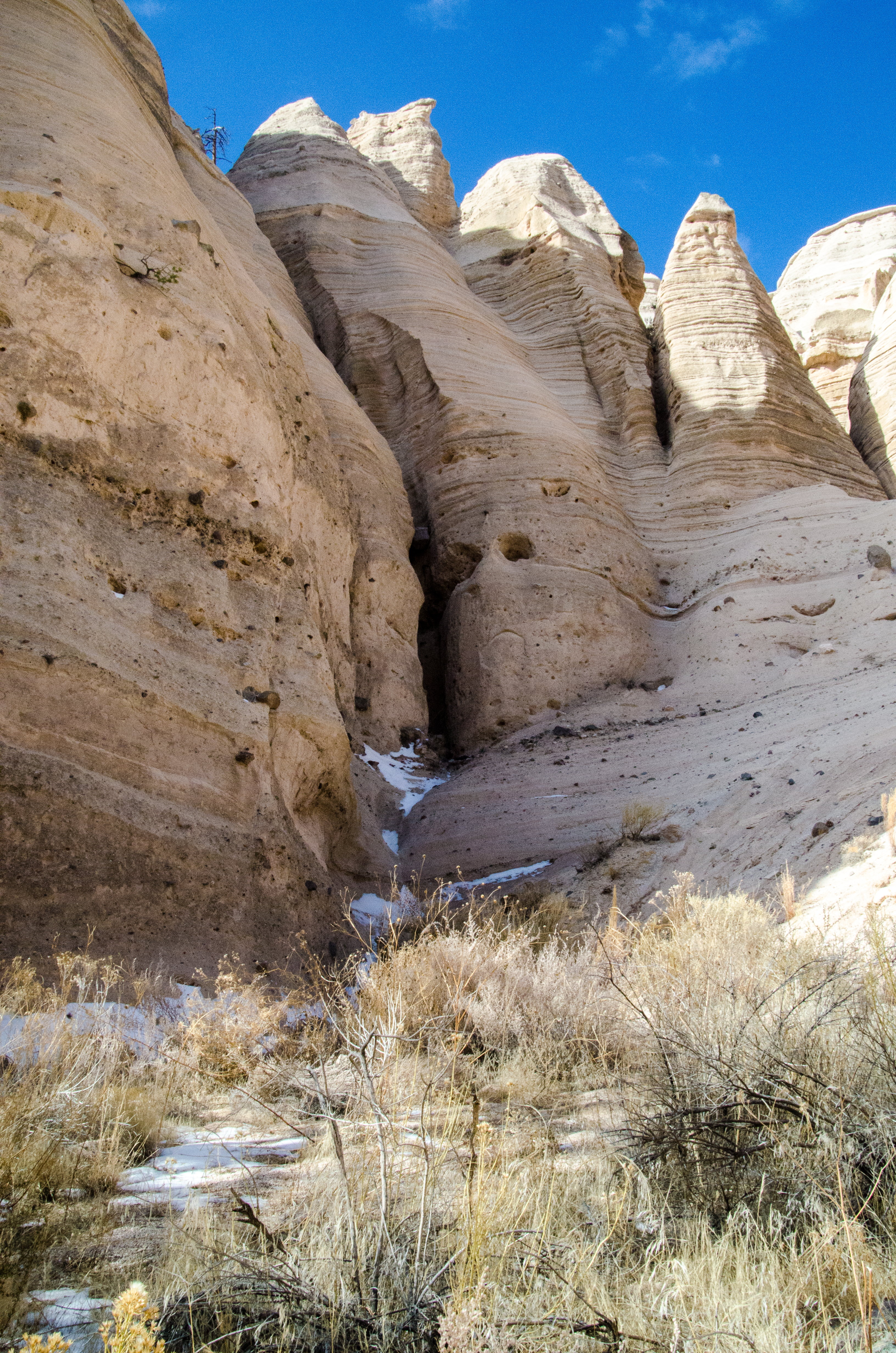 The volcanic deposits with their varying rates of erosion created hoodoos and conical tops giving the area the name “Tent Rocks.” One of the main hiking trails winds through a slot canyon where the sun seldom reaches. In and near that slot canyon I found areas of light and shadow that created interesting patterns on the rock surfaces. Other places the sun seldom reaches contain the remains of the winter’s snow. I submit for your approval a small gallery of images in the shadows of Tent Rocks, New Mexico.