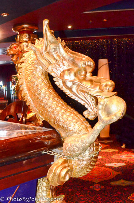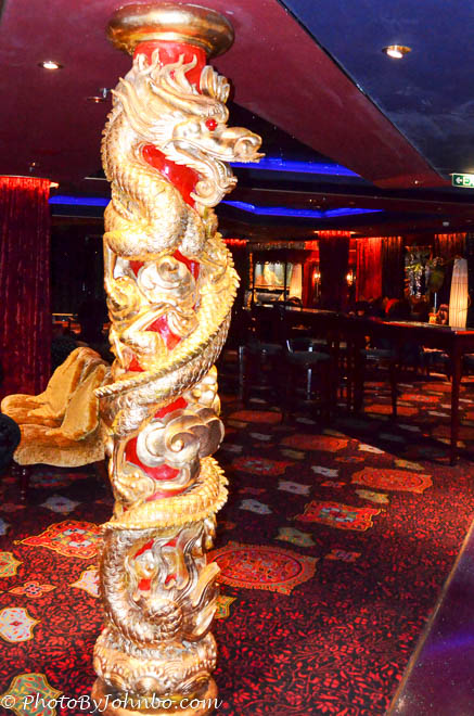 The lounge area features ornately carved snake-like dragons on the support columns as well. Their intricate design enhances the design of the bar and lounge. These two photos are my submission for this week’s Photo Challenge.
