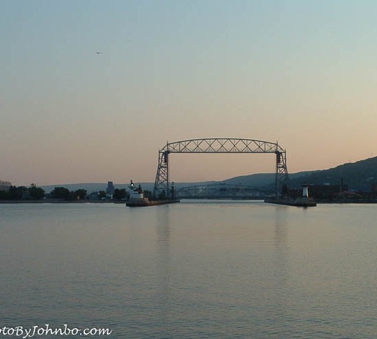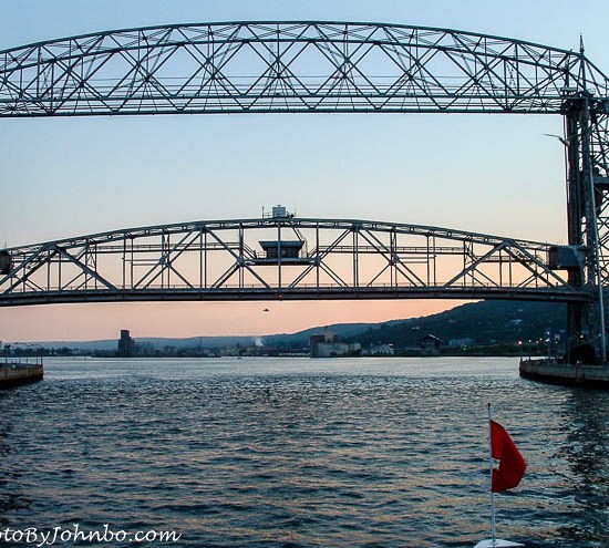 One of the major landmarks in Duluth is the aerial lift bridge. Connecting the Minnesota shoreline with a five-mile (8 km) sandbar known as Park Point; the lift bridge operates 24 hours a day, lifting out of the way for larger ships and tour boats to allow them to enter or exit the harbor. During the busy shipping season, the bridge raises and lowers an average of 26 times a day. When fully open, the 386 foot (117 m) long roadway is lifted 180 feet (54.8 m) above the water’s surface.