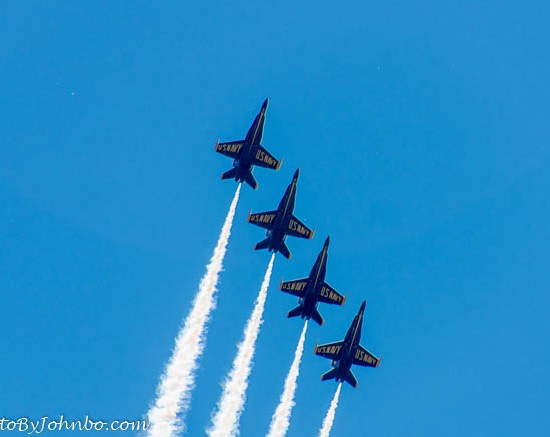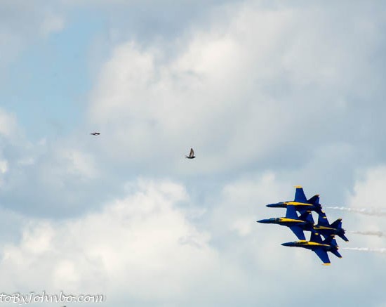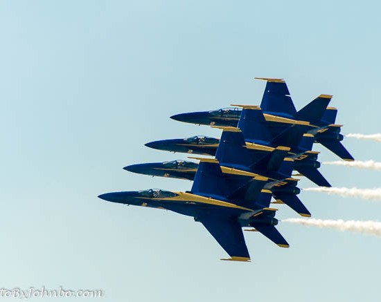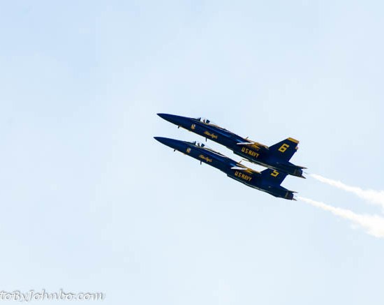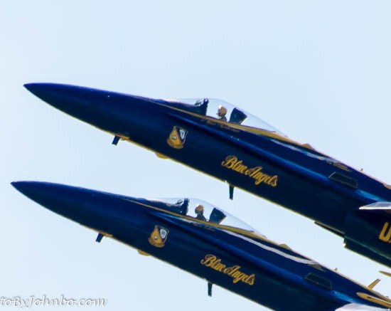 The image above was shot with my Nikon D7000 using my longest lens, a Tamron 18-270 mm lens at full zoom, then cropped in Lightroom and tweaked for maximum sharpness. The Tamron lens is inexpensive for its range, and the lens sacrifices sharpness and speed for low cost. Given that, it’s my most versatile lens and the only one I have that could get me “up close and personal” with the Navy Flight Demonstration Team. In the image above, the pilot’s features are not sharp, but they are sharp enough to see the lead pilot (upper) is looking straight ahead, and the wingman is looking to the right directly at the other pilot, exactly as he should be.
