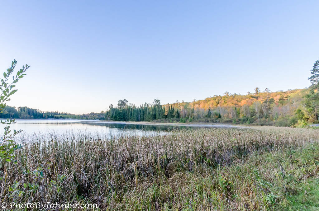 As the sun climbed higher, it started to illuminate the trees on the western bank of the lake giving them a surreal glow. The morning was calm and a slight mist rose from the lake surface. By this time, the mist was barely discernable along the shoreline.