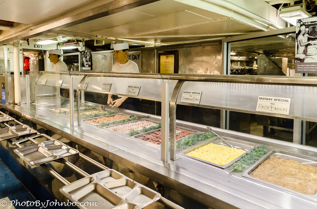 The floating city needed to supply 13,000 meals daily. That was accomplished through four kitchens. The main chow line is depicted in the image above. In her varied career, the USS Midway saw action in Vietnam and in the first Persian Gulf War. To find out current information, museum hours, ticket information and more details, check out the website here. The gallery of images below feature just some of the areas that are open to visitors to view. Click on an image to enlarge it and to scroll through the gallery.