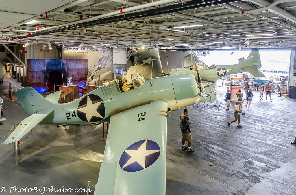 The self-guided tour starts at the hangar deck where static displays of historic aircraft are up close and personal. Probably the smallest detail about the Navy’s ship construction was revealed to me. The USS Midway is numbered 41. As Navy ships are built, they are numbered in sequence. The newest Navy aircraft carrier in the fleet as this is being written is number 77, the USS George H. W. Bush. The USS Midway is over 1000 feet (305 meters) long and weighs around 70,000 tons (63503 metric tons).