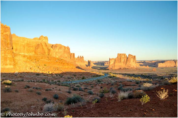 In the desert near Moab Utah, the morning sun brings out the golden tones of the buttes in Arches National Park.