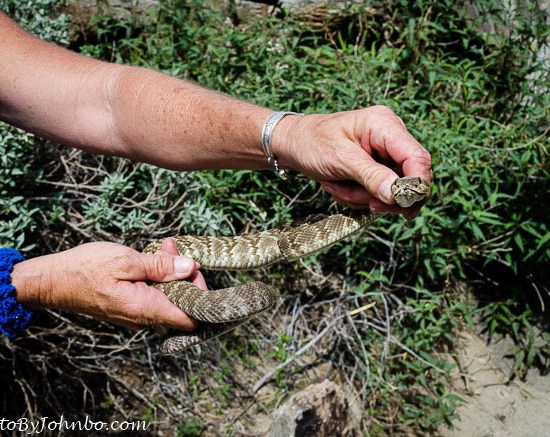 Hiking in the winter in Arizona is relatively safe from encounters with rattlesnakes. These desert-dwelling serpents pack a nasty and often fatal venom with their bite. During the winter months, they hibernate underground. In the spring, they awaken and head out from their shelter to sun themselves on rocks and trails. This small rattlesnake was discovered next to the trail, in a position to harm anyone who might carelessly wander too close. On this particular trek, we happened to be hiking with a professional EMT. Her skill set and her hiking gear includes equipment for the proper handling of these poisonous reptiles. Using the tools and the skills she has learned, she safely moved the snake off the trail so as not to present an immediate hazard to hikers. Hikers not equipped with the proper tools and skills need to give the rattler a wide berth. They are known to strike and hit their target at a distance of over twice their length. This fellow is the only rattlesnake my wife and I have ever seen on a hike.