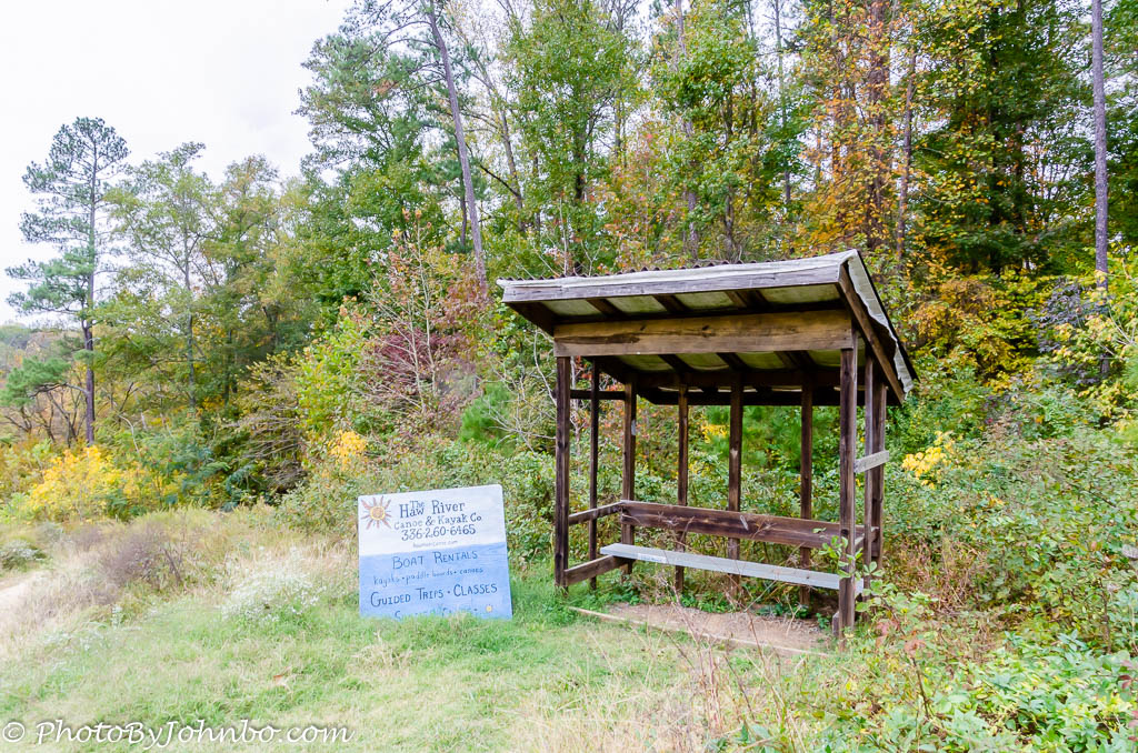 On our way to Pittsboro, on US-15/501, we crossed a bridge with an unassuming sign labeled Haw River. On the north side of the highway is a small turnoff that might well be unnoticed when motoring by. That turnoff leads to a small parking area and a pick-up/drop off area with a covered bench and a sign advertising the Haw River Canoe & Kayak Company. On this day, however, we were not there for a boat ride. We only stopped to check out the river and the fall colors.