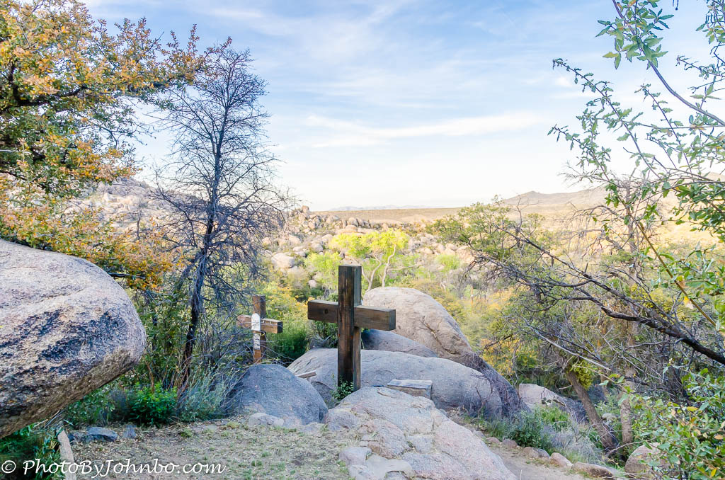 The last station at the top features a sculpted crucifix. We arrived at the top just after sunset. On the way down, other sculptures, all life-size make the journey down as moving as the journey to the top. In 2013, a major wildfire burned around 8,400 acres (3,400 ha). The Yarnell Hill Fire started by lightning strikes on June 28. On June 30, 19 members of the Granite Mountain Hotshots from the city of nearby Prescott were killed when the fire overran their position. The fire destroyed 129 structures in the area and impacted the shrine by destroying the gift shop, three work and storage buildings and the crucifix at the top. Many stations and guard rails were damaged as well as three more buildings lost at the retreat center.