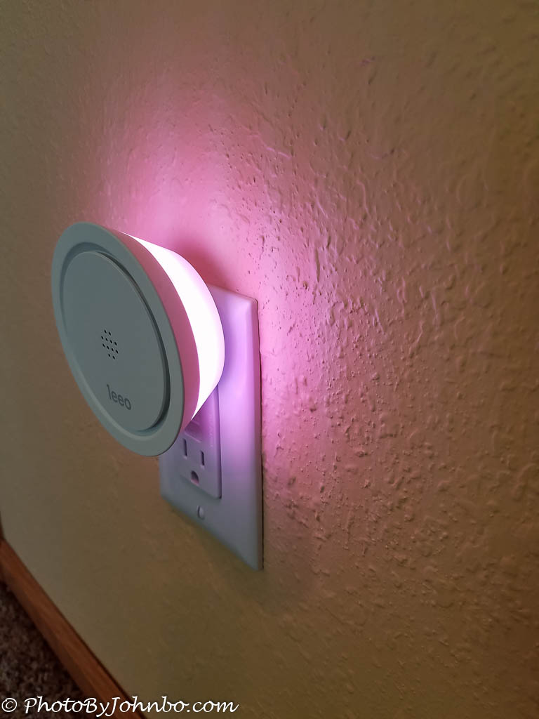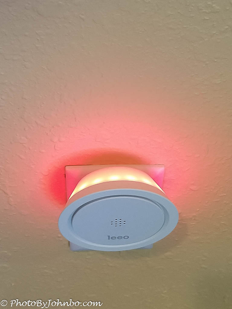 This digression is a review of a product that’s been monitoring my Fargo Condo for several months. If I’d have had this device in February of 2013, it might have saved us a 10-month stay in an apartment while our building was being cleaned and two units completely rebuilt because of a fire. You see, Leeo listens for the standardized sound of a fire alarm. Those holes hide a sensor that is capable of discerning the difference between the sound of a smoke alarm, a CO (carbon monoxide) alarm and even a water alarm. When it hears an alarm, it uses WiFi to start calling people from a pre-populated calling list. Once a call is answered, it plays back the sound of the alarm to allow you to confirm the alarm sound is not a false alarm. It is then up to you to notify appropriate authorities. As a bonus, it’s a smart phone programmable night light, and it reports the current temperature and humidity in the residence when you check in to the app on your Android or IOS device. In the photo above, the device is on in nightlight mode. You can tell it to burn the light continuously or only illuminate when the room is dark. When we leave for days or months at a time, we leave the night light off. No reason to have it on.