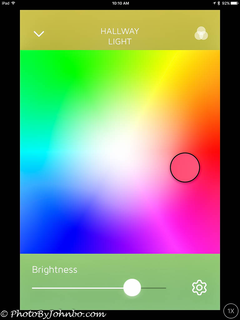 The photo above is a screenshot of the night light brightness and color display. You can select a color from the palette and adjust its brightness from one screen. The display above was captured by my iPad. Control is easy and intuitive, you just have to lift your finger from the display for the new setting to take effect, and you can make the adjustment from wherever you’re connected to the Internet.