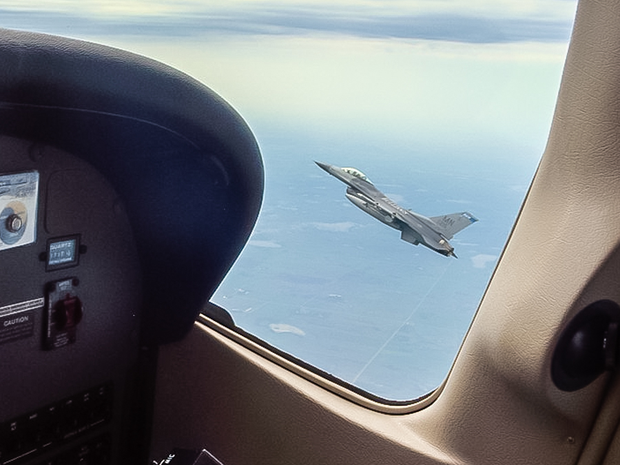 If you happen to be flying along in your little Cessna 4-place airplane, and one of these pulls up along beside you; that will be the first sign you are in trouble. The U.S. Air Force and National Guard have to be ready to interdict aircraft that stumble into protected airspace, inadvertently or on purpose. Fighter jets aren’t designed to fly at the slower speeds of small private aircraft and the military pilots need training in procedures and techniques for interdiction. CAP aircraft and pilots are called upon to help with that training. I was along on one such mission. Our role was to fly into a pretend restricted airspace and to further pretend that our radio was either turned off or inoperative. When we flew into that “protected space”, two fighter jets were dispatched toward Fargo from Duluth, Minnesota, about 220 miles (356 km) away. In only a few minutes, an F-16 appeared off our left wing and started making slow speed circles around our aircraft.