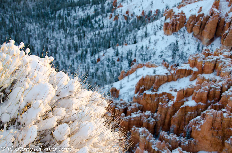 Another high point in Utah is Bryce Canyon. Our October trip surprised us with a fresh covering of snow. Though I have several views from Bryce Point at sunrise, one of my favorite shots is this view of a snow-covered plant that lives atop the canyon. If it only had eyes, it could see the beautiful view that surrounds it atop this scenic canyon rim.