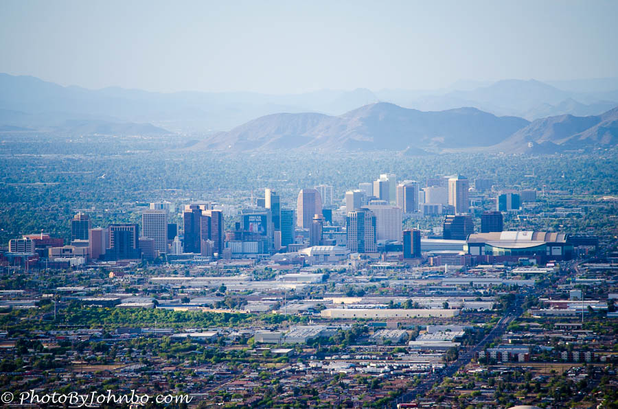 This view from on top of South Mountain in Phoenix was earned. Though I could have driven up to Dobbins Point and parked in the large parking lot, this image was captured after hiking the Holbert Trail, a relatively short trail with a 1200-foot (366 m) rise to Dobbins Point. The image of the Phoenix downtown was brought closer with the aid of a telephoto lens.