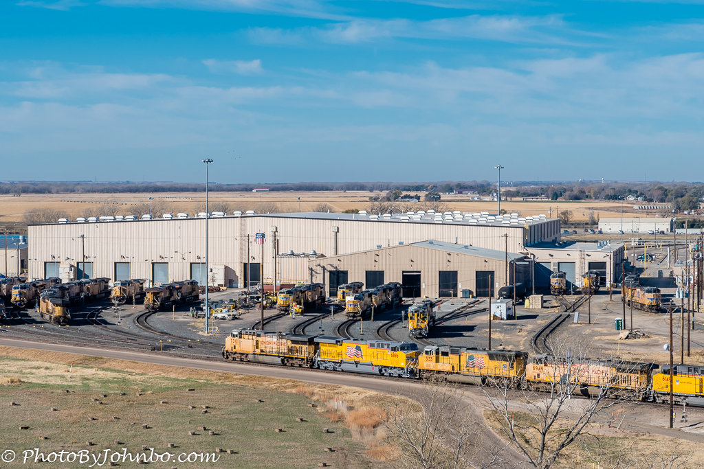 A closeup of the locomotive maintenance facility is the subject of the image above. If you are near North Platte between September 15 and 17, 2017, consider visiting the yard during their second annual North Platte Rail Days. A collection of civic groups and community leaders come together to sponsor a celebration of the yard and of railroad impacts on the community. In 2016, the first annual Rail Days focused on the 150th anniversary of Union Pacific at North Platte. Union Pacific is a major employer in North Platte with over 2600 people directly employed at Bailey Yard. The gallery of images below feature shots captured from the observation decks of the Golden Spike Tower. Click on an image to enlarge it and to scroll through the gallery.