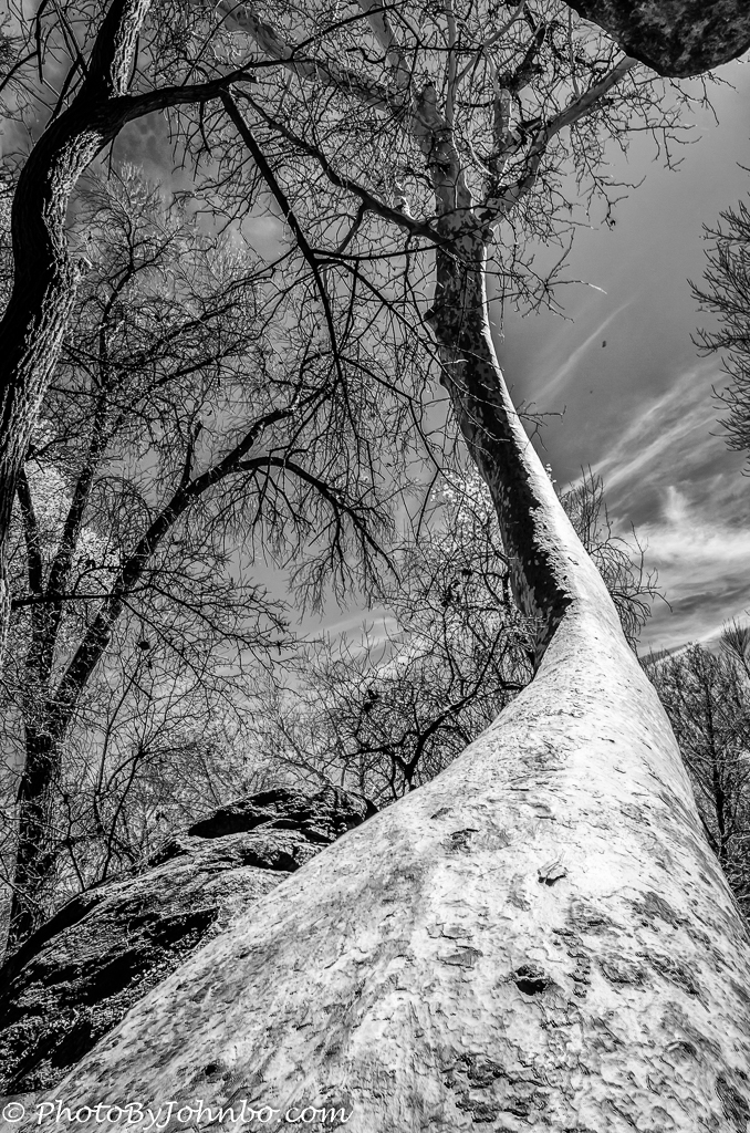 For Monochrome Monday, check out this sycamore tree. With seeming intelligence beyond my expectation, this sycamore needed to wrap around a cliff ledge overhang in order to achieve maximum sunlight. If your eyes follow the trunk to the extreme top of the image, you’ll see the edge of the cliff that it had to negotiate around.