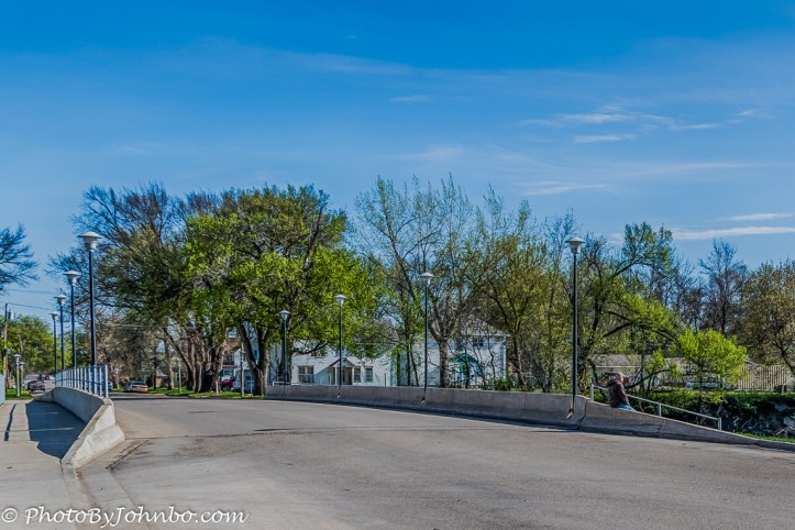 Progressing southerly on our tour, we stopped at bridge #4, the Mill Dam Bridge. The first bridge on the site was a wooden structure, replaced in 1936, and most recently replaced by the modern structure shown below in 1991. On this early Sunday morning, a gentleman was sitting at the edge of the bridge watching the Sheyenne River flow around the bend near a dam and the 1878 flour mill, Valley City’s first mill.