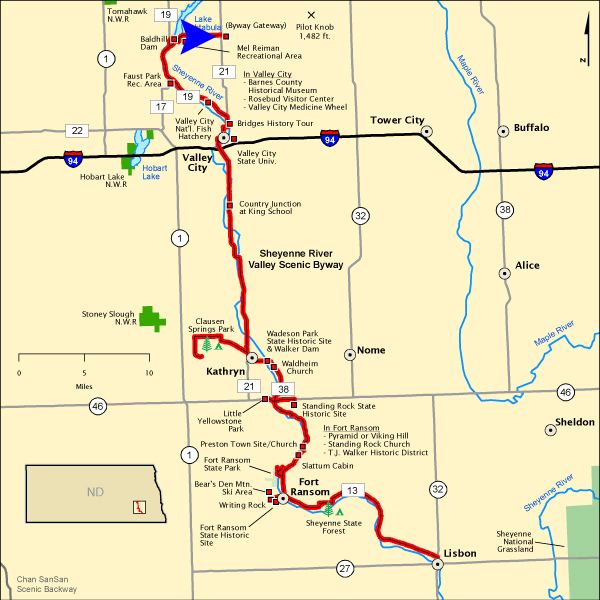 The map above is reproduced from the Federal Highway Administration website. The blue arrow at the top indicates where we are on the byway. You can start the drive from either end, but since we live near I-94, it made the most efficient way for us to start at the north end and venture south toward Lisbon. For those who want to explore every location fully, the estimate given on the national byways webpage recommends 9 hours. We elected to plan an early morning drive to the city, and finish at Lisbon for a late lunch. In all, the 9-hour estimate was pretty close, starting a bit before 7 AM and arriving at Lisbon around 2 PM. Had we spent a bit more time at Fort Ransom State Park, we could have easily exceeded 9 hours.