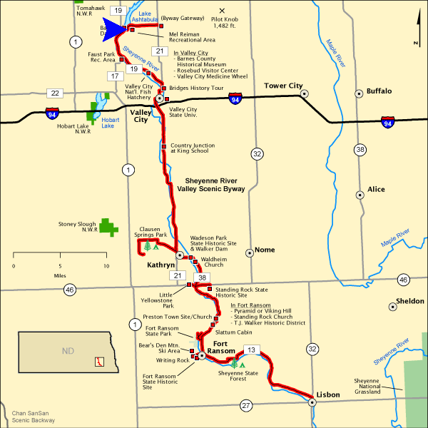 On our second stop along the Sheyenne River Valley Scenic Byway, we find ourselves at the Mel Rieman Campground and Recreation Area. See the blue arrow on the map below for our location. This beautiful campground isn’t huge, only 70 acres, and it’s only open during the summer season. This year, the season is from May 1 through September 30, 2017. In the short season, however, there are plenty of things to do. There is a visitor center, playground, picnic facility, a boat ramp and fishing facilities.