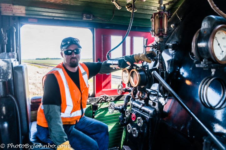 Reaching down, he opened the firebox so that we could get a photo. This engine is a true coal burner. It’s the fireman’s job to shovel coal into the firebox and to tend the fire for efficient operation. More views of the cab are in the gallery at the end of this post.