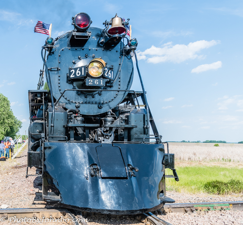 On this Independence Day, let’s go back to the last century when Rail was King and a train trip was a daily occurrence for the traveler. Awhile back, a post on Facebook clued me in to the arrival of Engine number 261 from Minneapolis. I found there would be three days of excursions in early June and I immediately went online to order tickets. Of course, with the reaching power of Facebook, the tickets were all sold by the time I got there. At least I could visit the community of Davenport and see the old steam train as passengers loaded. I was pleased to find that we could climb into the cab and get a look at the belly of the beast.