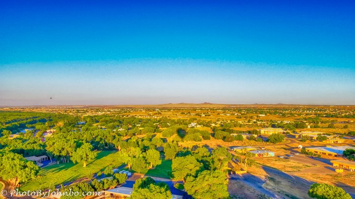 The week of our family reunion brought us to Albuquerque and the main purpose for our 3200 mile (5150 km) road trip. This was our second reunion trip to New Mexico. In 2002, our first family reunion in Albuquerque featured a balloon ride, so it was fitting that another balloon ride should be on the agenda. And so it came to pass on Thursday morning. We arose well before sunrise and a subset of our family carpooled the 20 or so minute drive to our appointment with a large hot air balloon. Six of the Steiners found ourselves climbing into the basket along with a pilot and another family. Nearby another balloon was also readying for flight. Soon we were airborne over the city of Albuquerque. The relatively light winds carried us in varying directions depending upon the altitude the pilot chose. At one point, we flew over the Rio Grande River and he descended to within a few feet of the surface. He commented that he’s been known to touch the water, but never when the wind and the water are flowing in opposite directions as they were this morning.