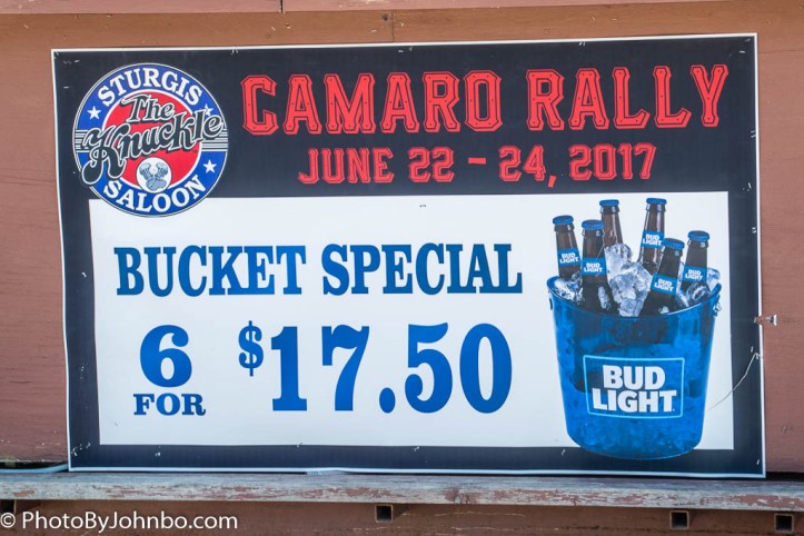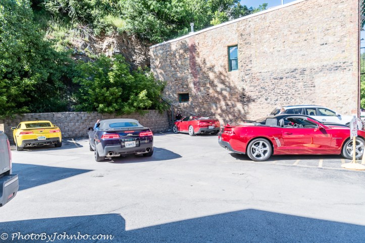 Sturgis was not without a rally during our visit, as it turned out. We arrived on June 23, smack in the middle of a Camaro Rally. There were Camaros of all vintage driving throughout the Black Hills as well as more than a few motorcycles. In the photo below, a parking lot was filling up with a collection of Camaro Rally participants.