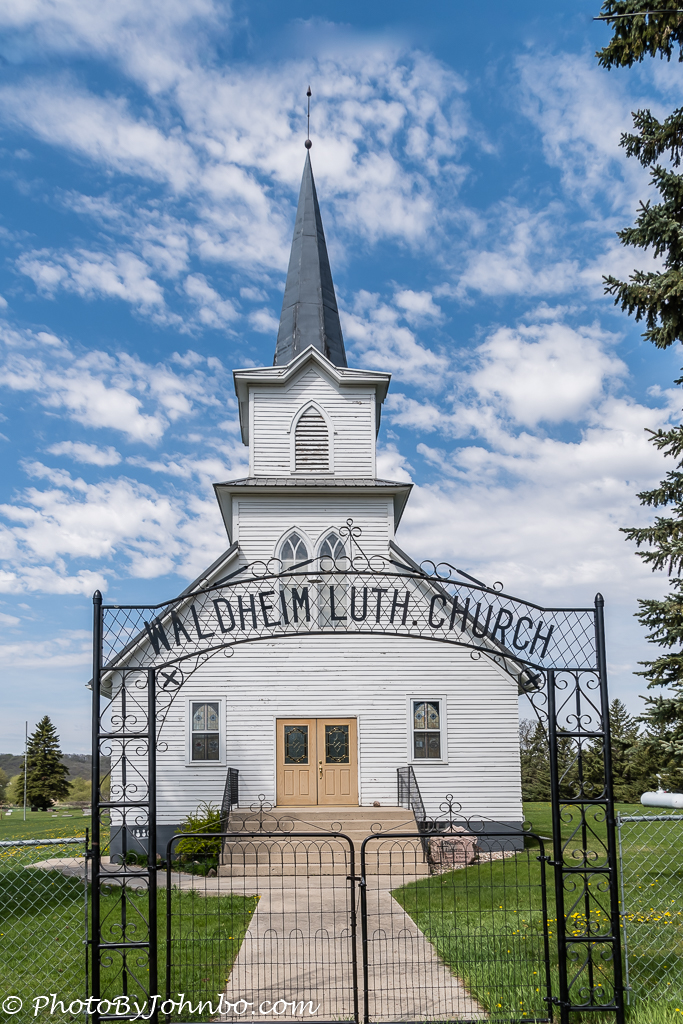 Near the town of Kathryn, the Waldheim Church is also still an active parish. The church building was constructed in 1900 and the congregation is active in the ELCA Lutheran Church. As with most country churches, the history of the congregation can be gleaned by taking a short walk through the adjacent cemetery, visible just to the left in the photo below.