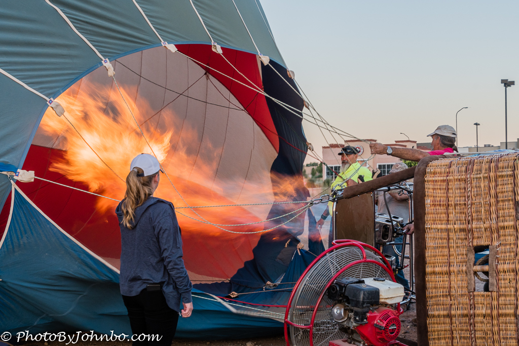 The inflation starts with a gasoline powered fan (lower right) just blowing air into the balloon. Once there’s enough air to support the top of the balloon, the pilot starts heating the air so the balloon eventually rights itself.