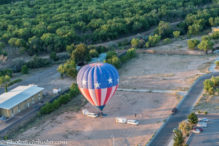 At one point, we settled down over the Rio Grande River. We did not touch the water, though the pilot said that on days when the wind direction matches the direction of river flow, a touch is possible. When they are in different directions as they were on this day, there is a chance of tipping the balloon. We were appreciative that we didn’t get an early morning dip in the river.